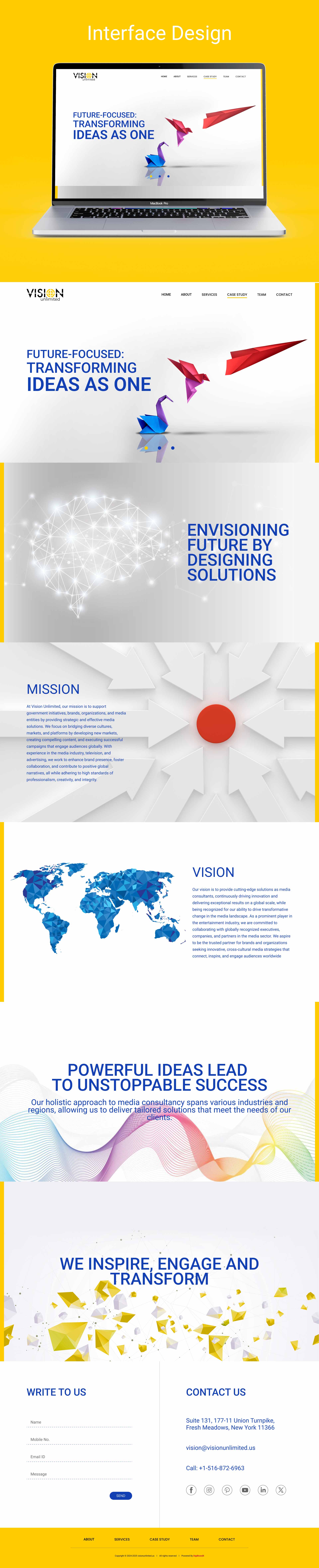 DigiBrandX, a website branding agency, designed and developed the corporate website for Vision Unlimited, a USA-based full-spectrum media consultancy. The site combines bold metaphorical visuals with seamless navigation to express their visionary storytelling across television, digital, and global campaigns. A vibrant yellow and deep blue palette adds energy and professionalism, while motion and layout reflect their scale and ambition. Crafted as a media company website development project, the result is a powerful digital platform by a corporate website design and development agency that elevates the brand worldwide.