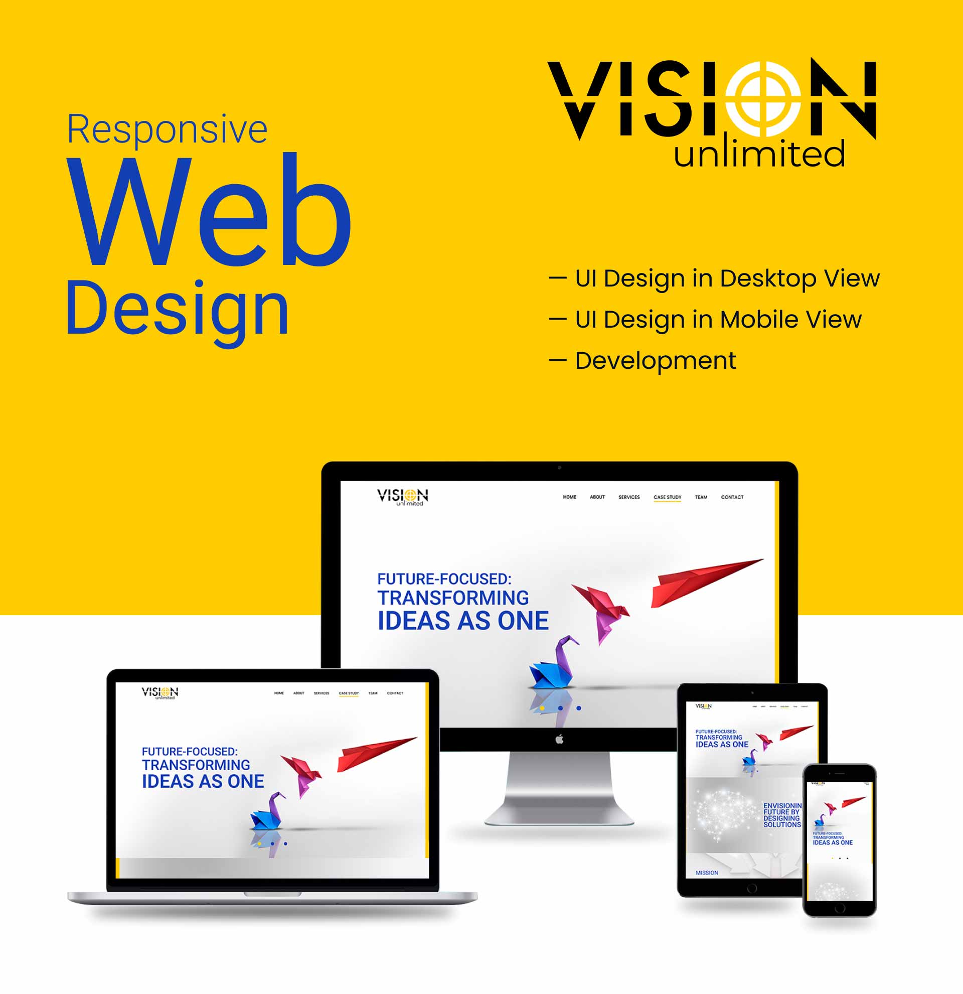 Color strategy played a vital role in defining the brand’s digital identity. Vibrant yellow conveys energy, optimism, and creative spark, while deep blue tones establish trust, professionalism, and global credibility. Bold yet refined typography enhances clarity and authority across all devices.